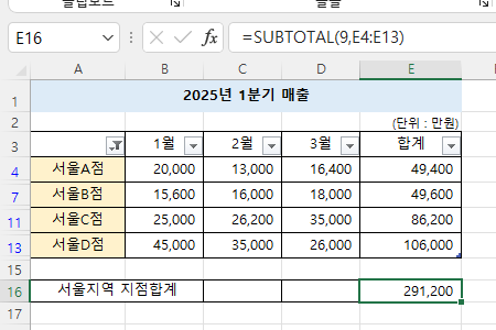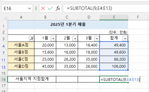 4개지점의 합계를 계산하려면 필터링상태에서는 SUBTOTAL함수를 이용합니다.