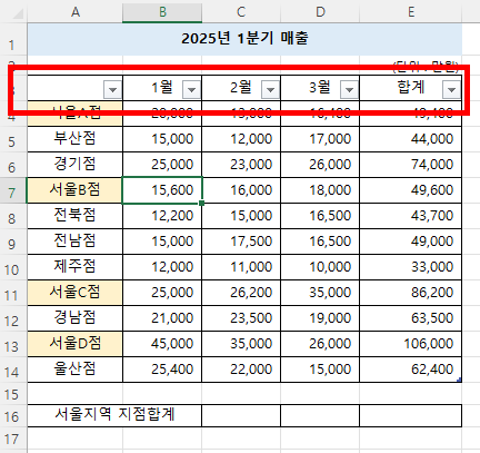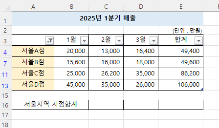 매출표가 있습니다. 여기서 서울지역의 매출합계만 계산해보겠습니다.