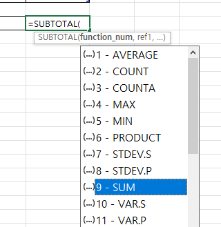 합계를 구할것이니까, 덧셈에 해당합니다. 그래서 SUM인 9를 첫번째 인수로 입력합니다.