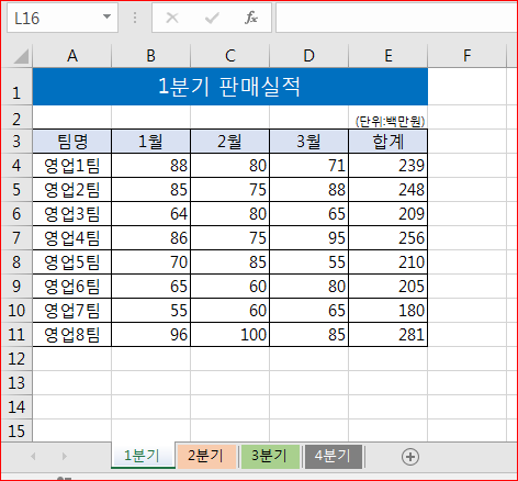 1분기시트를 보이지않게 숨겨보겠습니다.