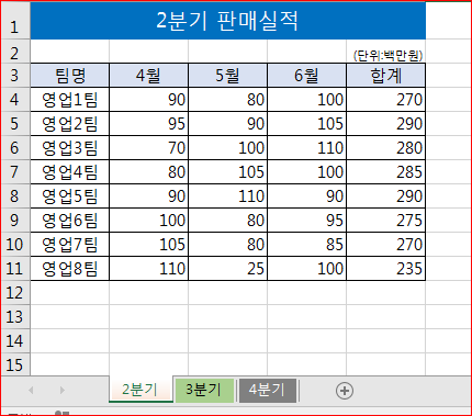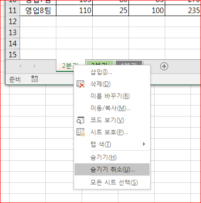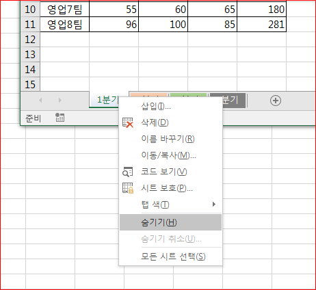 1분기시트탭에 마우스를 대고 오른쪽누르면 나오는 메뉴중에 숨기기를 클릭합니다.