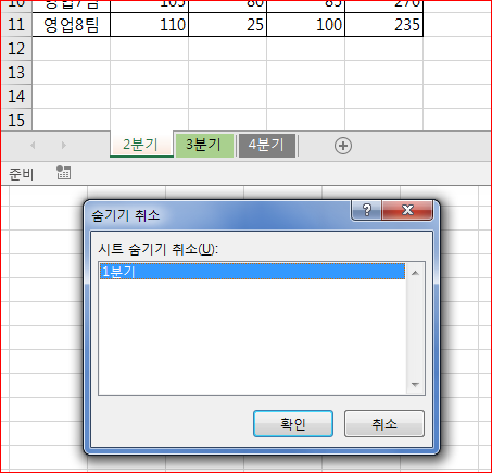 그럼 대화상자가 나오는데 만약 여러개의 시트탭을 숨기기했다면 이중에서 원하는 탭을