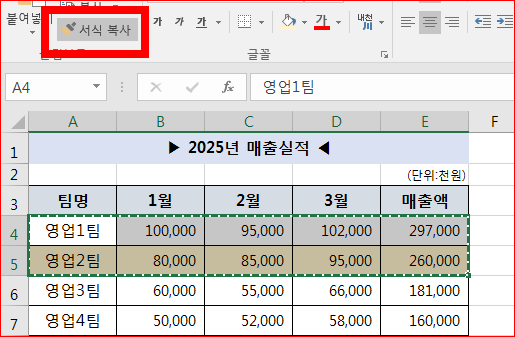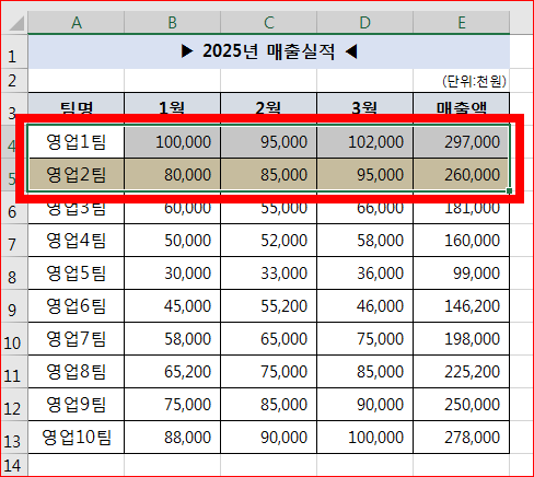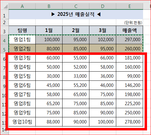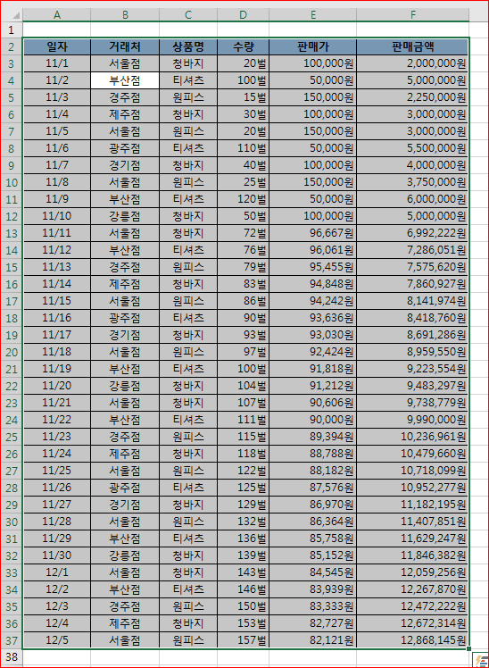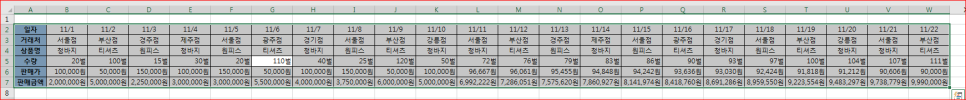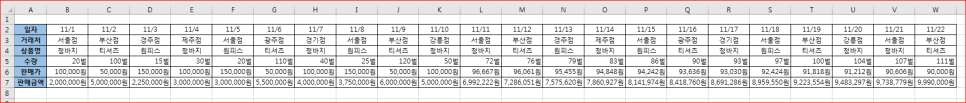 기간(월)을 강조한 가로표를 지역을 강조하기위한 세로표로 바꿔보겠습니다.