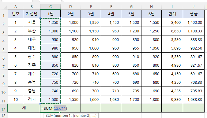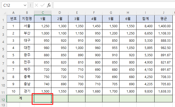 월별합계를 구하려면 C12셀에 커서를 놓고 자동합계에서 합계를 클릭합니다.