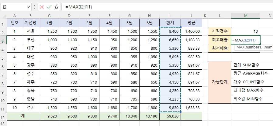 지점별합계중에서 최대매출액은 얼마인지 MAX함수를 이용해 구해보겠습니다.
