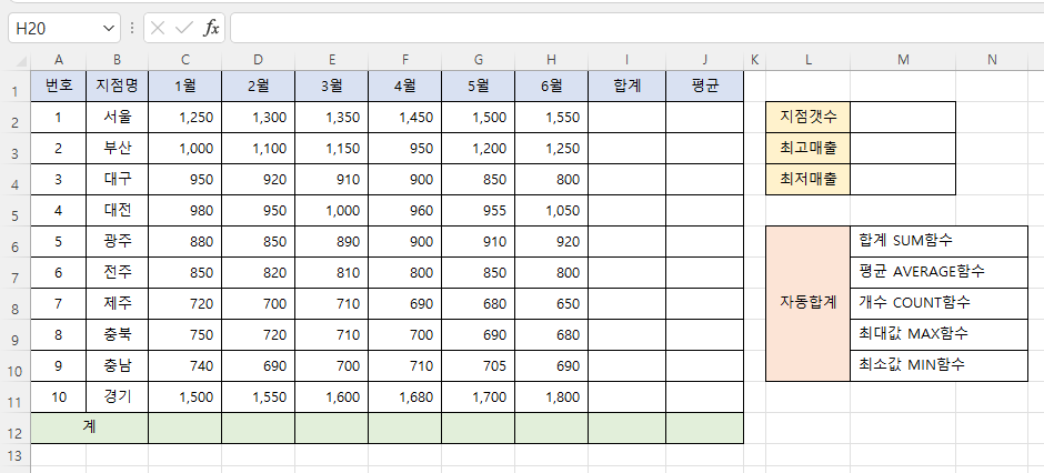 5가지함수를 장착한 자동합계를 이용해 위의 표 계산을 하겠습니다.