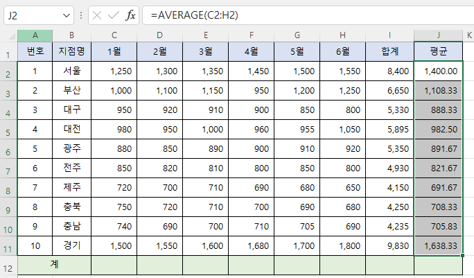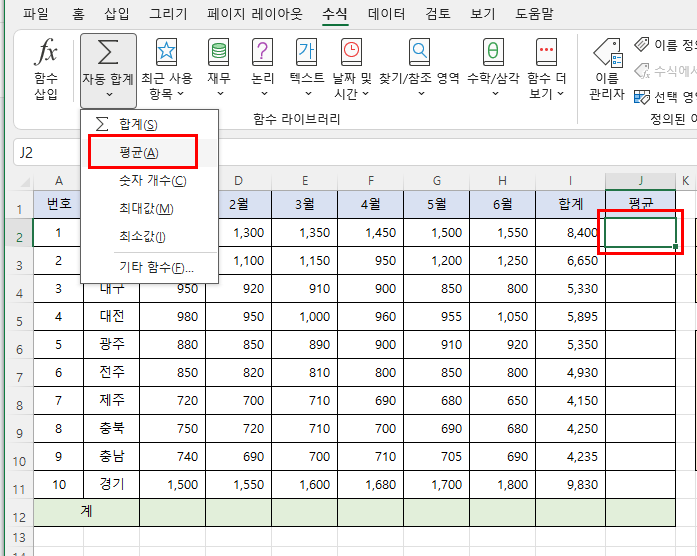 평균 첫셀에 커서를 놓고 자동합계에서 '평균'을 클릭합니다.