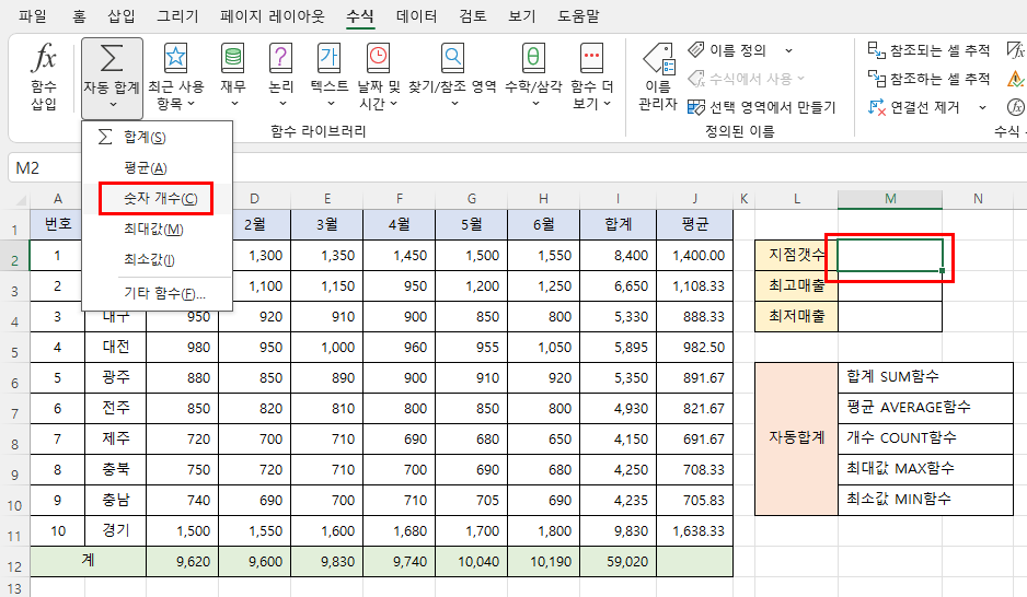 이번에 지점갯수를 구하겠습니다. 오른쪽 표의 지점갯수셀에 커서를 놓고 자동합계에서 '숫자갯수'를 클릭합니다.